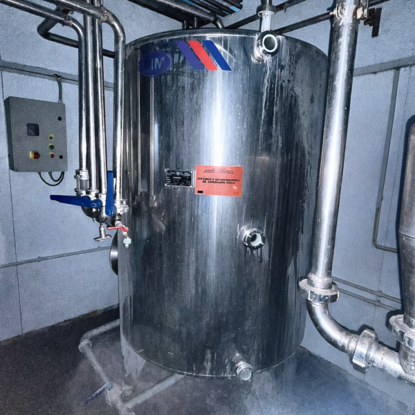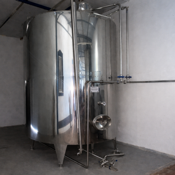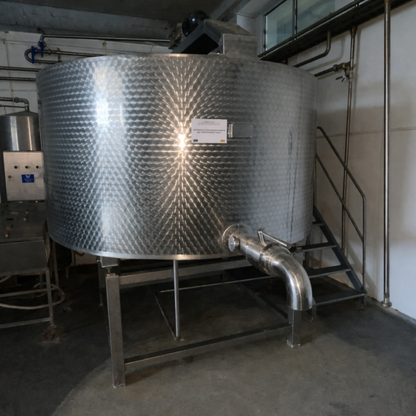 The tank is built from food-grade stainless steel and designed for reliable operation in industrial dairy processing environments.