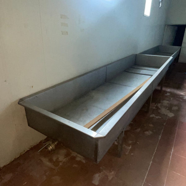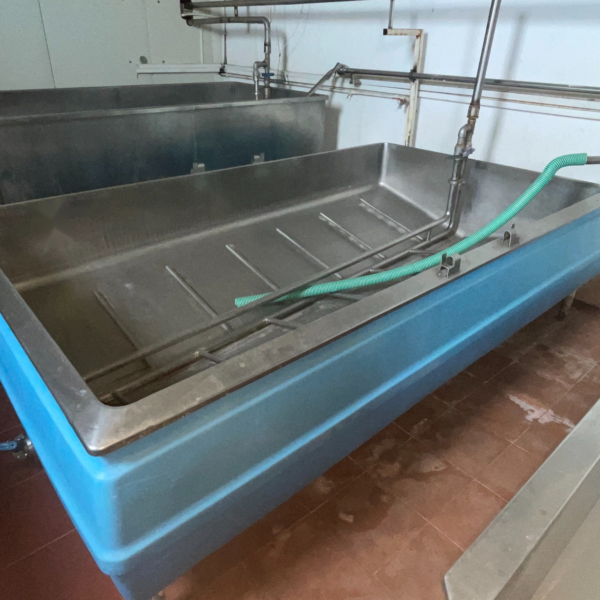 The vat includes internal stainless steel support rails and piping connections for efficient drainage and processing.