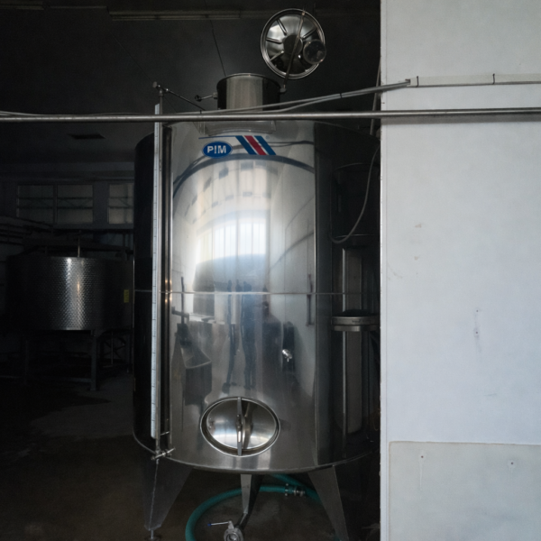 Used industrial stainless steel holding tank manufactured by PIM Ltd., Bulgaria, designed for storage and processing of milk and liquid dairy products.