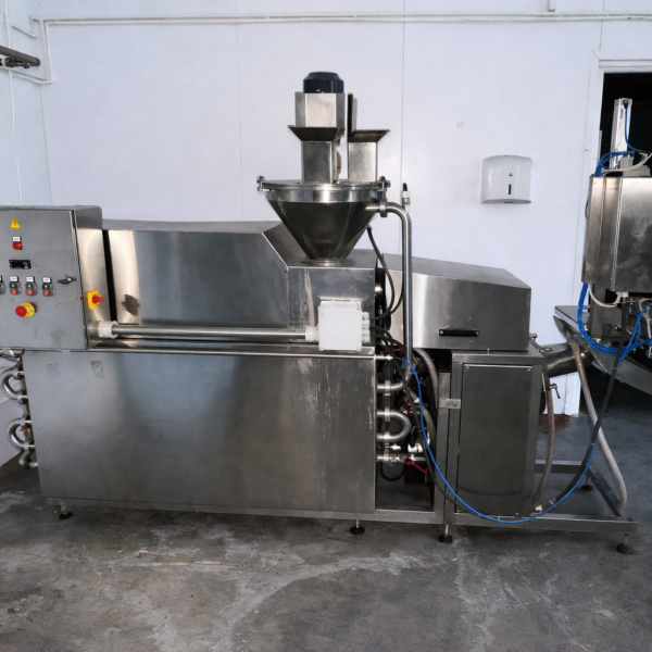 The stainless steel construction ensures hygienic operation and easy cleaning in food production environments.