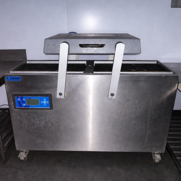 Industrial double chamber vacuum packaging machine manufactured by Henkovac (Netherlands) designed for professional food packaging operations.