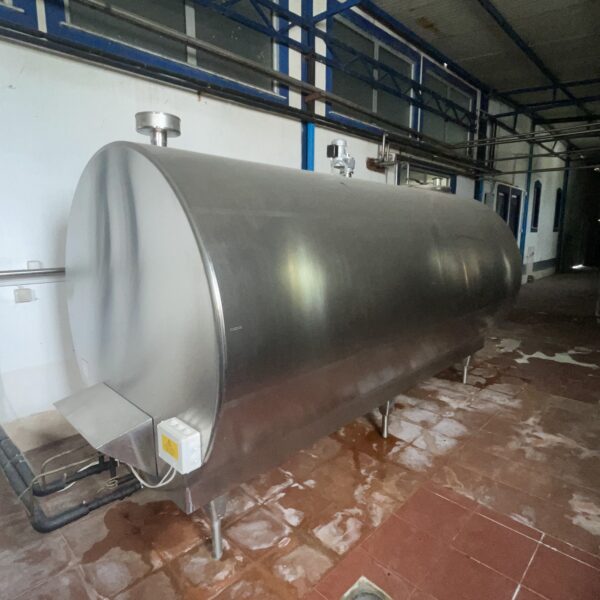 The vessel has a total capacity of 10,000 liters and features a hygienic stainless steel construction with insulation and integrated mixing system. The tank is suitable for dairy production, beverage processing and other food industry applications.