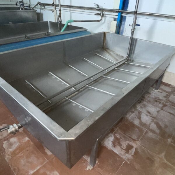 This large hygienic processing table is used in dairy plants for draining whey, processing curd and handling cheese during production. The stainless steel construction ensures food safety and easy cleaning, making it suitable for professional dairy processing environments.