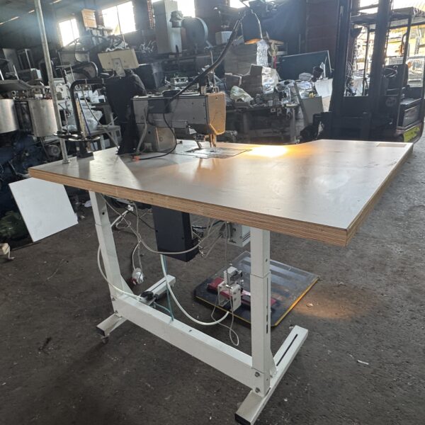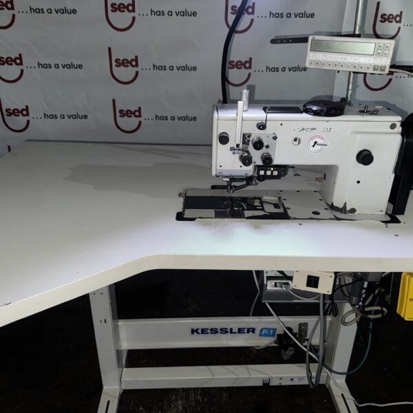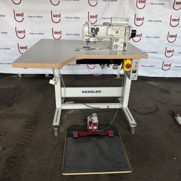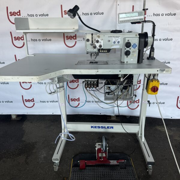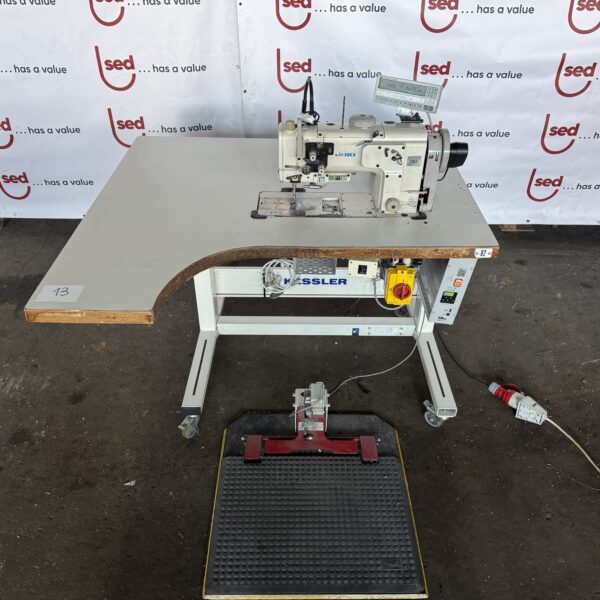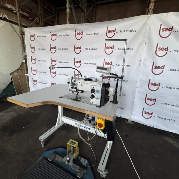 The unit is supplied as a complete sewing workstation including Kessler table, electronic control system, motor drive, pedal control, thread stand and industrial work lamp.