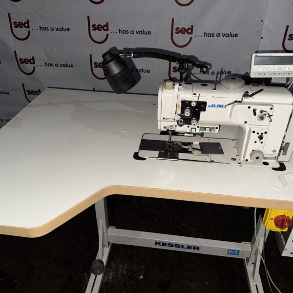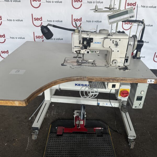 Used JUKI industrial sewing machine mounted on a professional Kessler industrial sewing workstation with electronic motor control and digital programming unit.