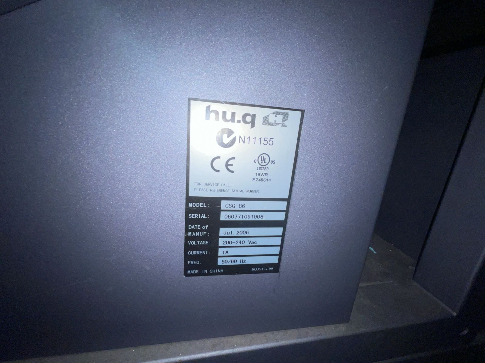 The system includes industrial electronic components such as the Hu.q CSG-86 module, manufactured in July 2006, operating at 200–240 V AC, 50/60 Hz with CE and UL certification. These components are designed for long-term operation in demanding industrial environments and ensure stable system performance.