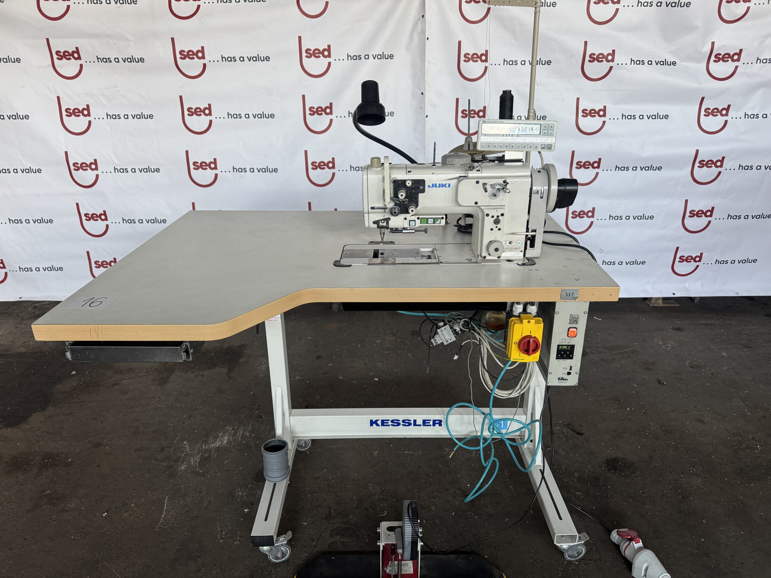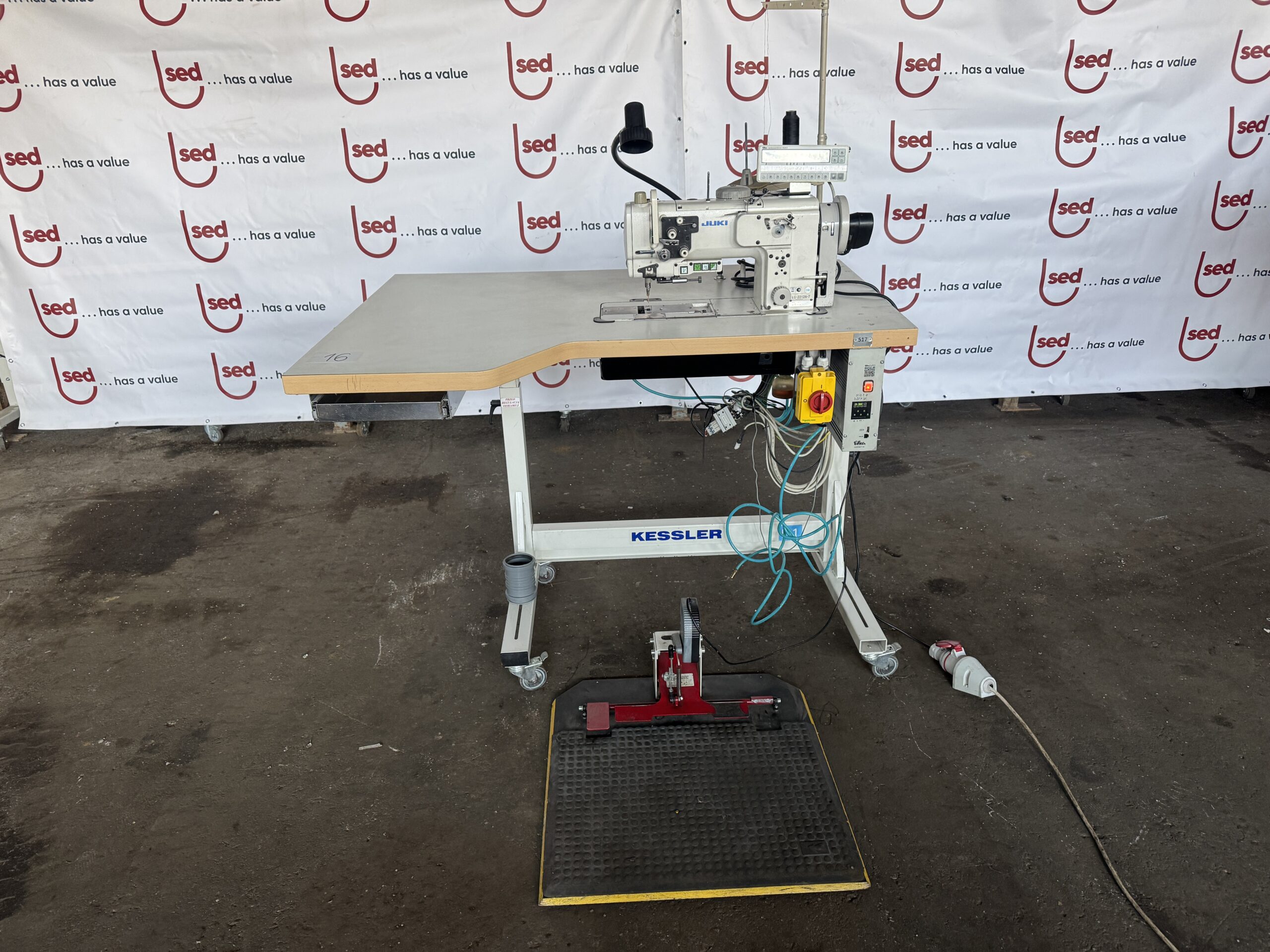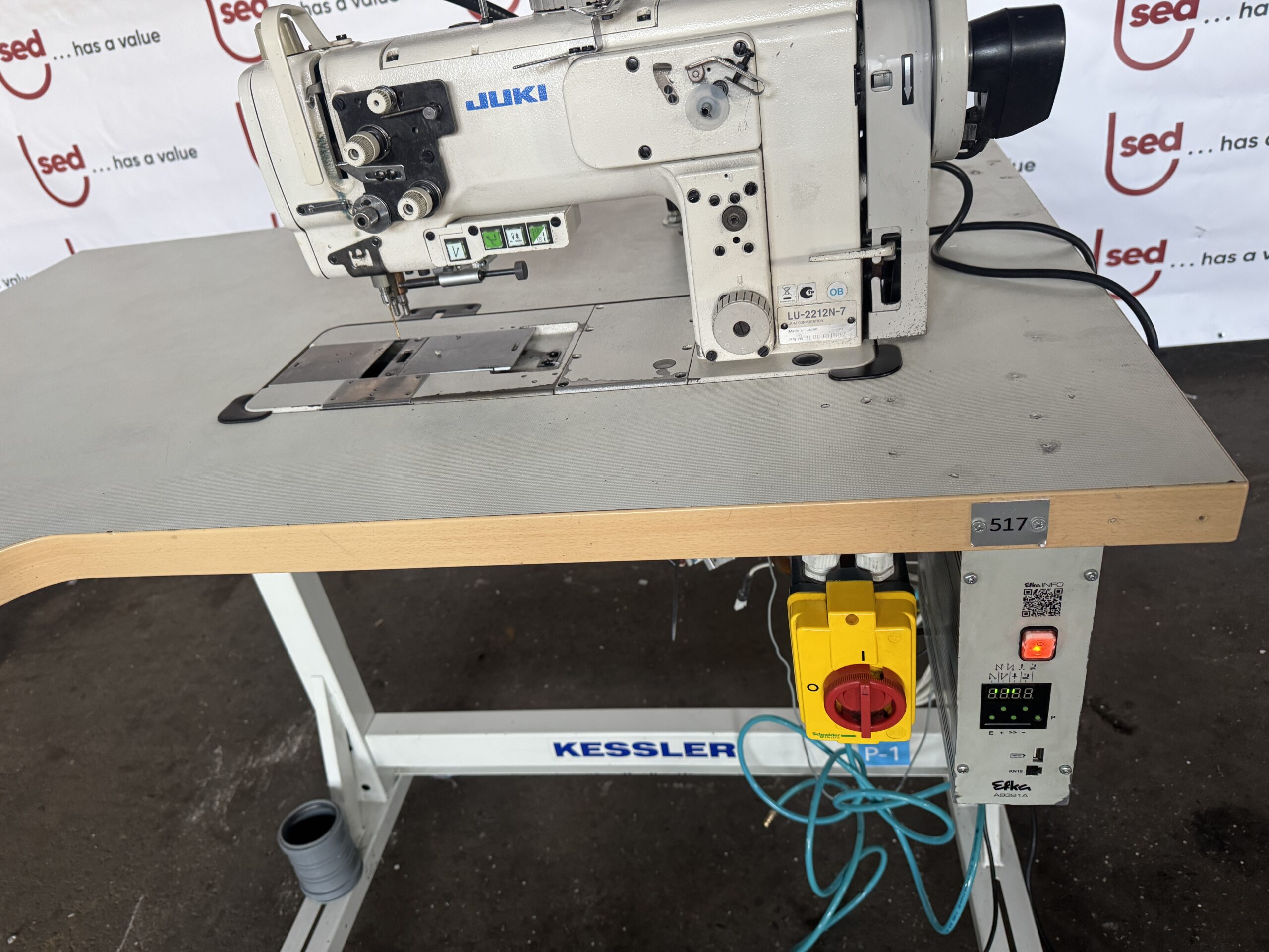Used JUKI LU-2212N-7 industrial sewing machine mounted on a professional Kessler sewing workstation.