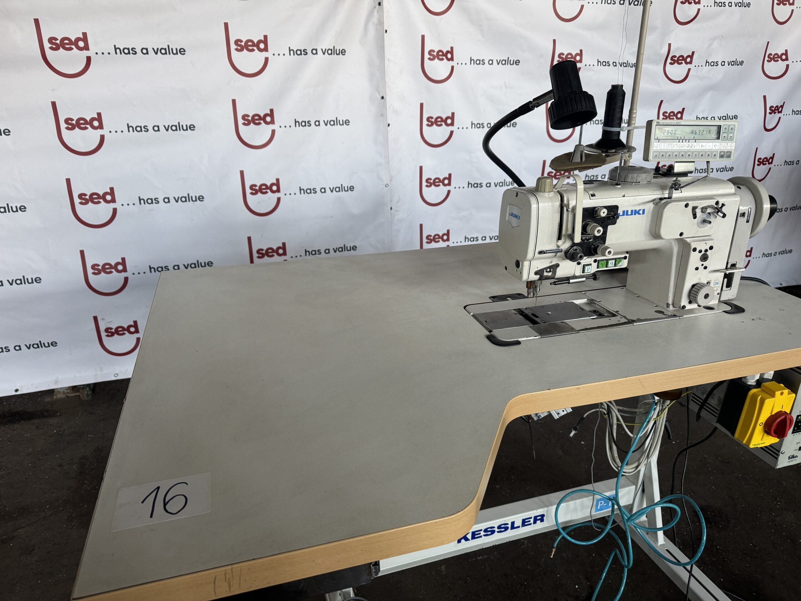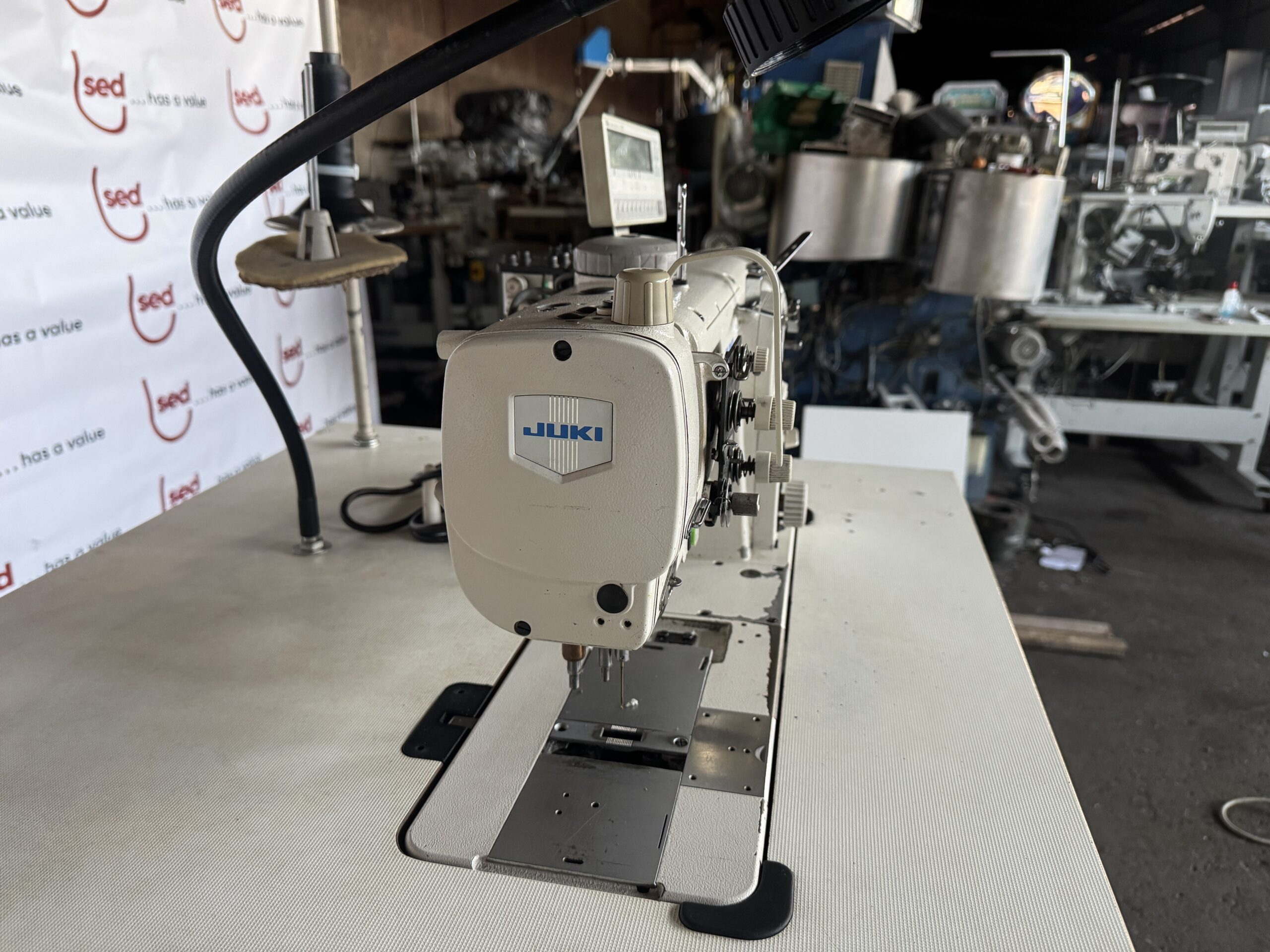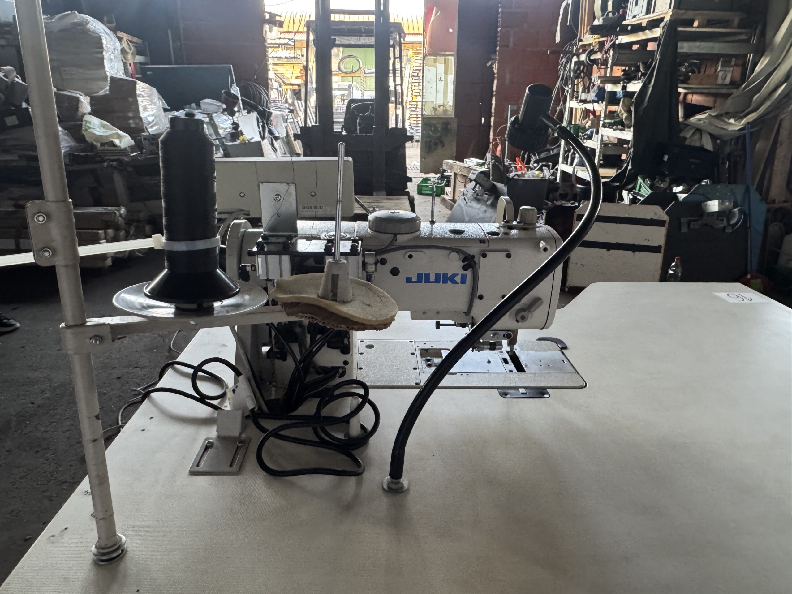 Used JUKI LU-2212N-7 industrial sewing machine mounted on a professional Kessler sewing workstation.