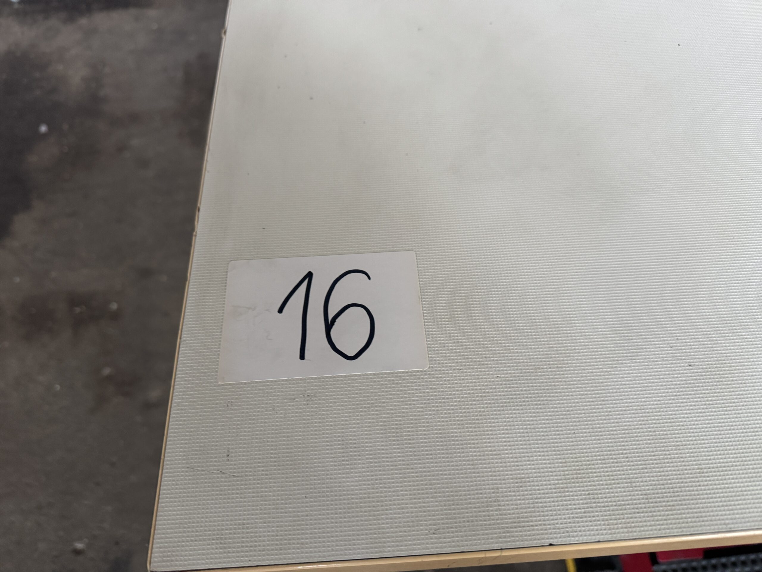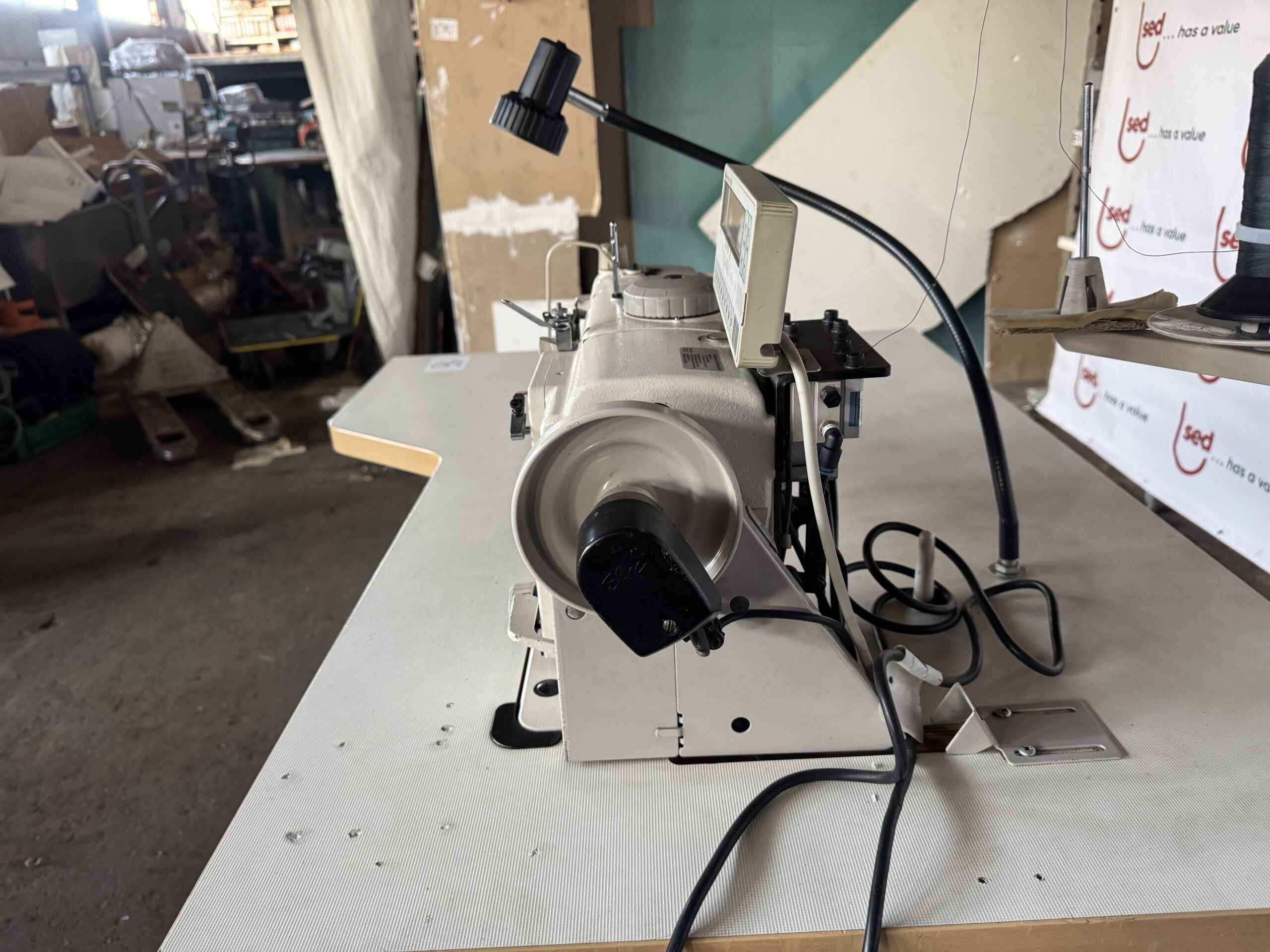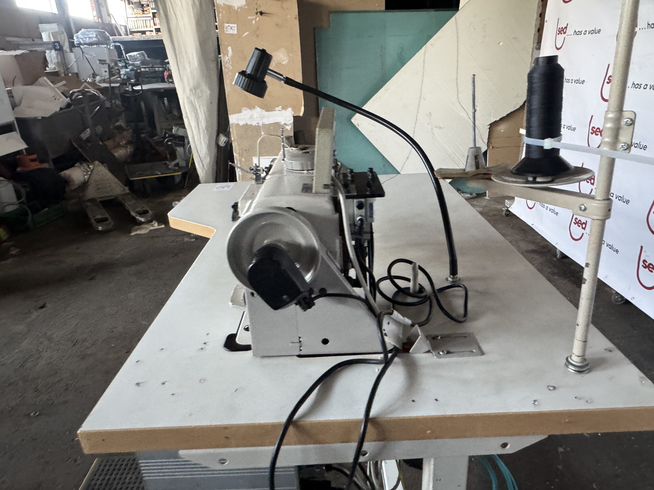 The unit is delivered as a complete sewing workstation including Kessler table, electronic control system, motor drive, pedal control, thread stand and industrial work lamp.